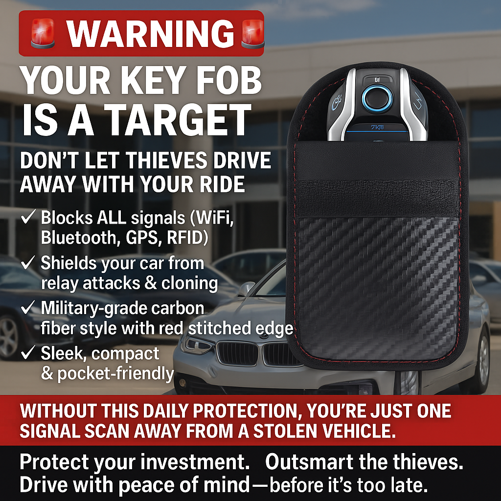 Discover the unbeatable protection of KeyGuard Pro—a compact bag that blocks all signals (WiFi, Bluetooth, GPS, RFID) to stop thieves from remotely accessing your keyless entry fob.